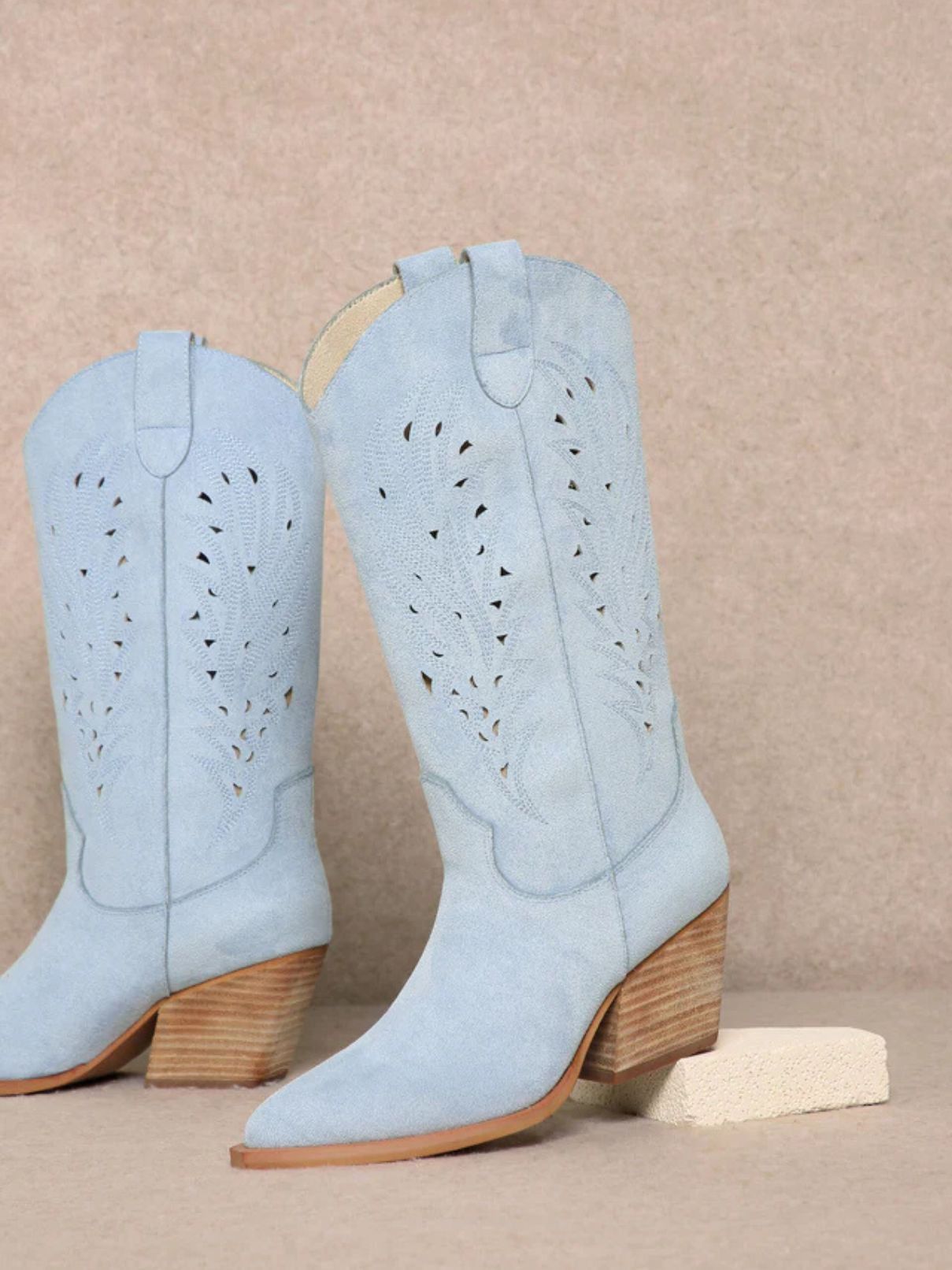 OLIVIA Cowgirl Boots – Lt BlueMake a bold entrance with the OLIVIA Cowgirl Boots. Crafted from vibrant red suede, these statement western boots are designed to turn heads with striking cutout details and a sleek, close-pointed toe. The 2.6" stacked heel adds just the right amount of lift, while the pull-on style keeps things effortlessly cool. Whether paired with a ruffle skirt, distressed denim, or a graphic tee, the Olivia boot delivers a fierce twist to classic western styling.