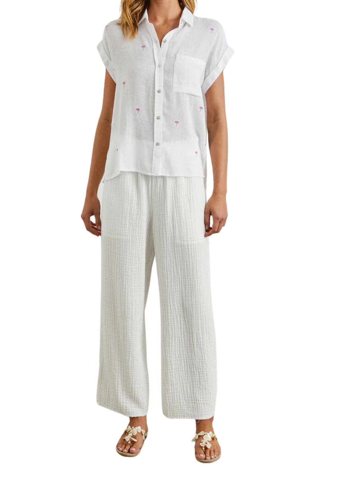 Rails Whitney Blouse in Fuchsia Embroidered Palms, inspired by coastal California, the Whitney shirt is made from luxe linen, featuring embroidered fuschia palms trees with a high-low hem and side slits to flatter your form.