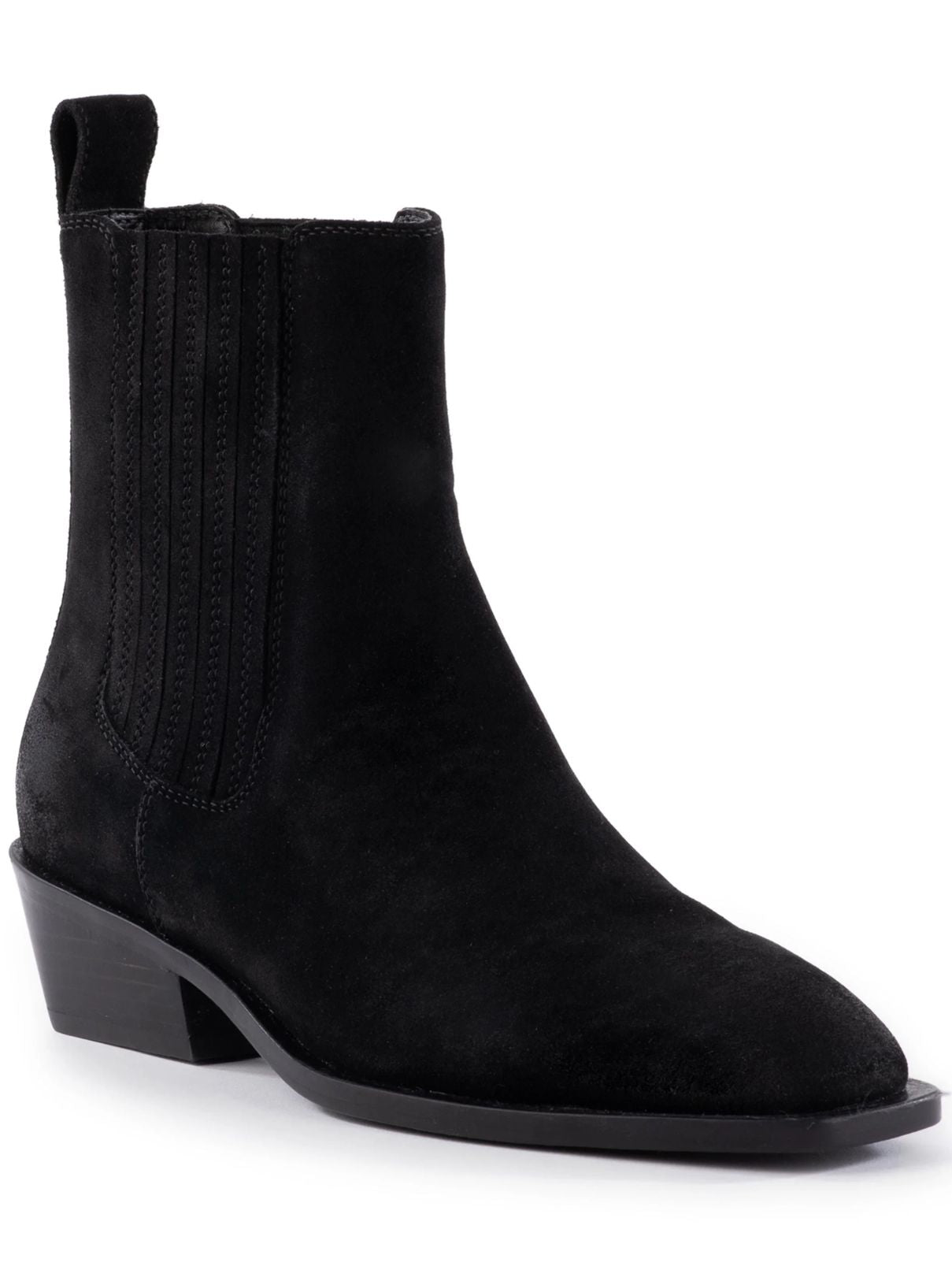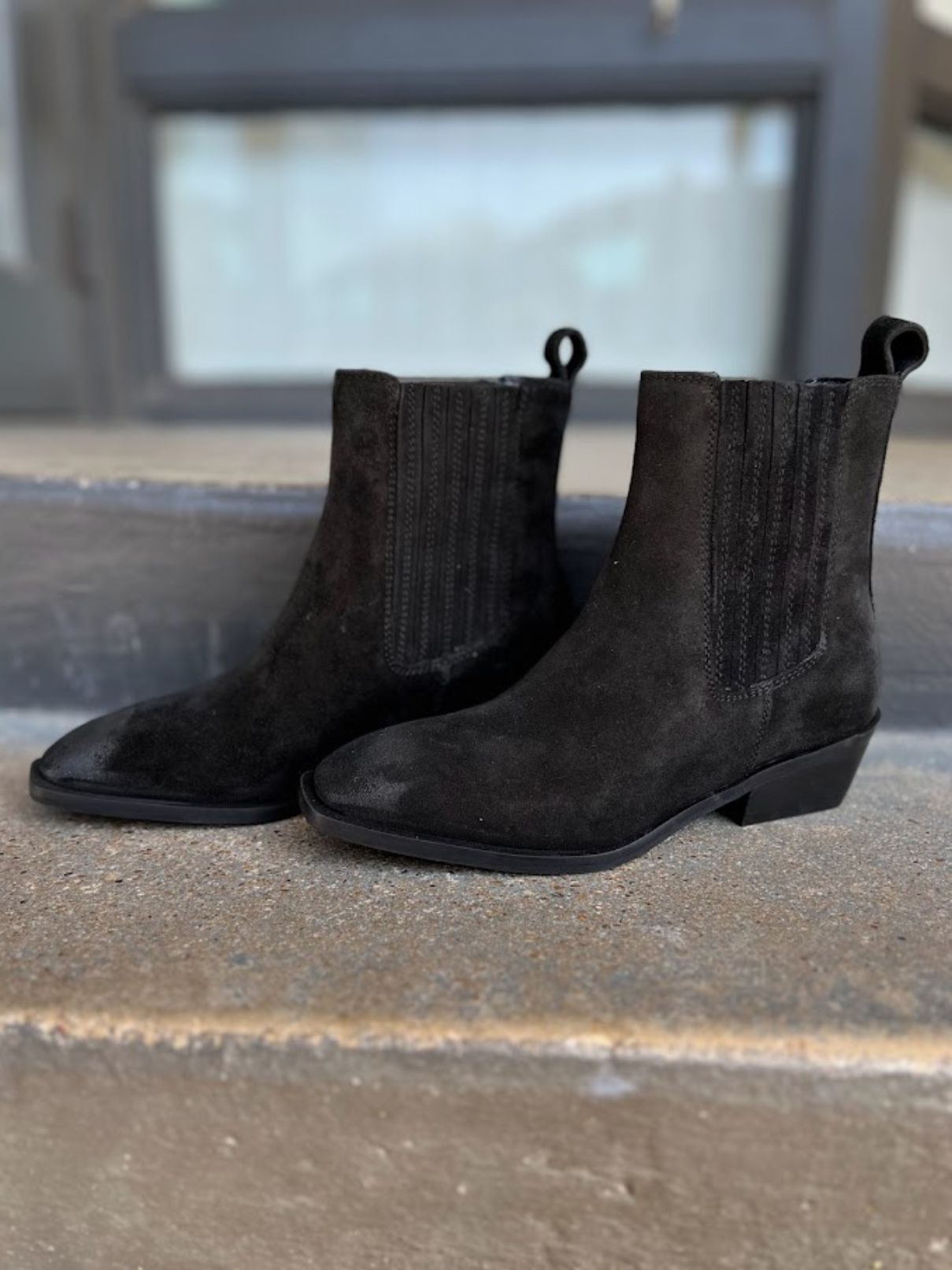 Seychelles Hold Me Down Boot in Black is an edgy modern western style boots with a low underslung heel. Featuring elastic gore with pull tab for easy slip-on and off.